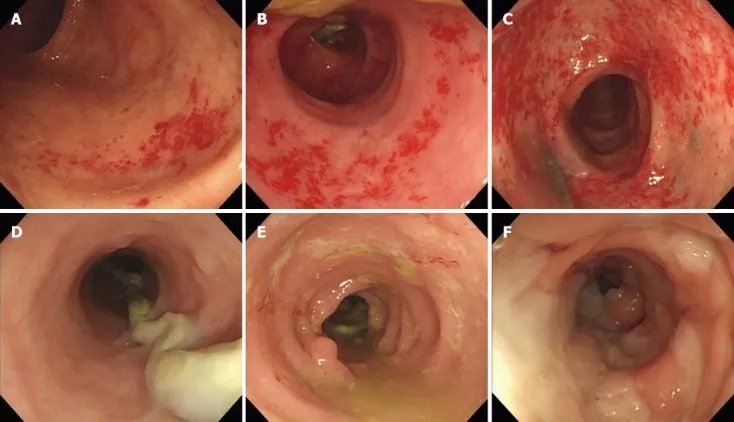 Рисунок 2. Показатели эндоскопического проявления при диверсионном колите [8]. Пример результатов в зависимости от относительной тяжести. A, B, C. Петехиальные кровоизлияния (A — 1 балл; B — 2 балла; C — 3 балла). D, E, F. Отек (D — 1 балл; E — 2 балла; F — 3 балла).