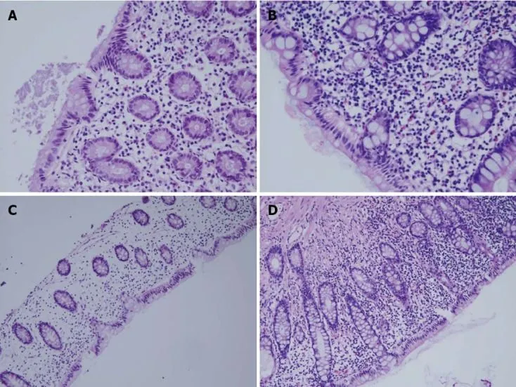 Рисунок 3. Гистологические проявления диверсионного колита. Пример основных результатов оценки в зависимости от тяжести. A, B. Эозинофильная инфильтрация (A — 1 балл; B — 2 балла). C, D. Хроническое воспаление с мононуклеарными клетками (C — 1 балл; D — 2 балла).