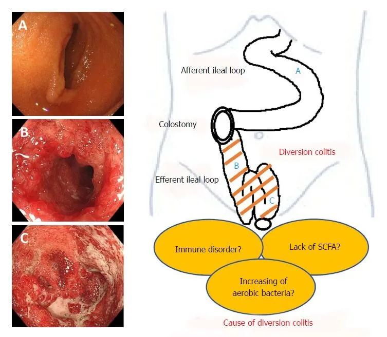 Патогенез. Механизмы возникновения диверсионного колита еще не полностью выяснены. Ключевым фактором в патогенезе является бактериальный дисбаланс, который возникает из-за нарушения нормального кишечного пассажа, что, в свою очередь, ослабляет защитные функции слизистой оболочки и снижает количество короткоцепочечных жирных кислот (КЦЖК).