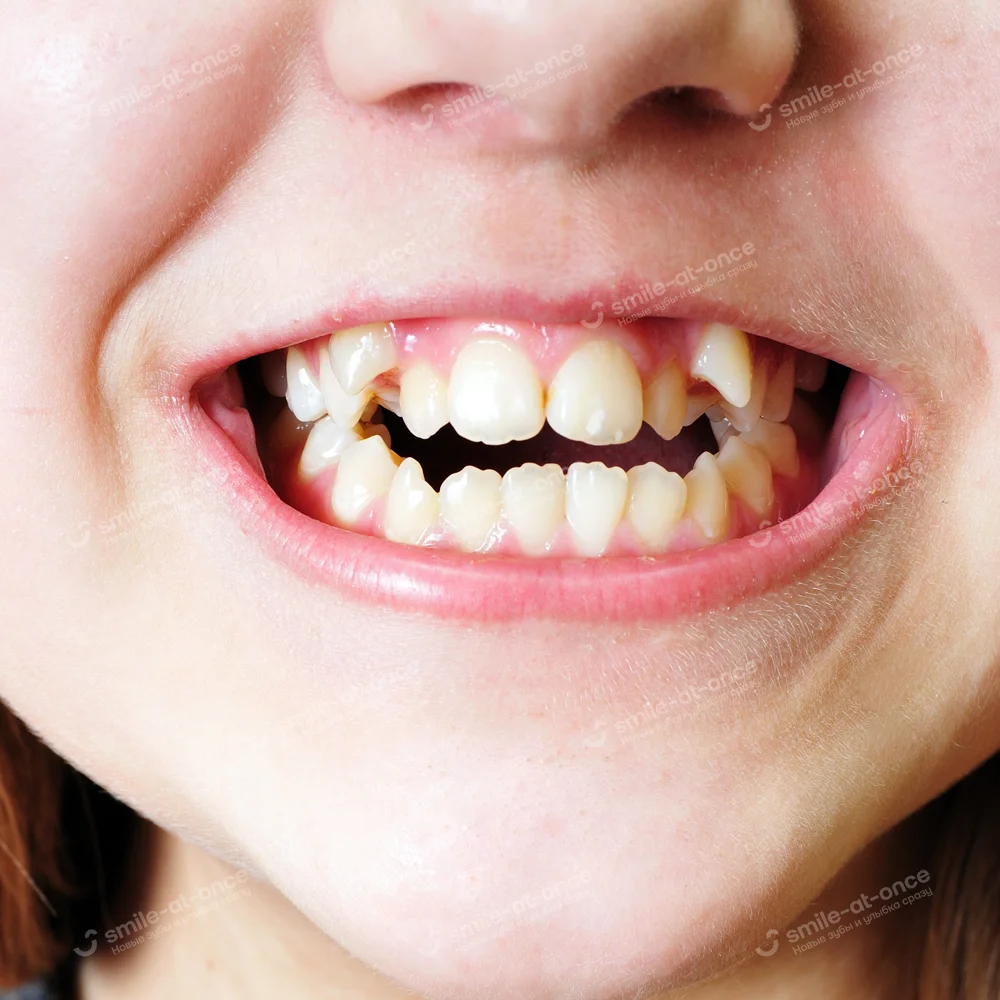 - Сильно выраженная смещенность зубов относительно друг друга — вбок, вперед или назад.