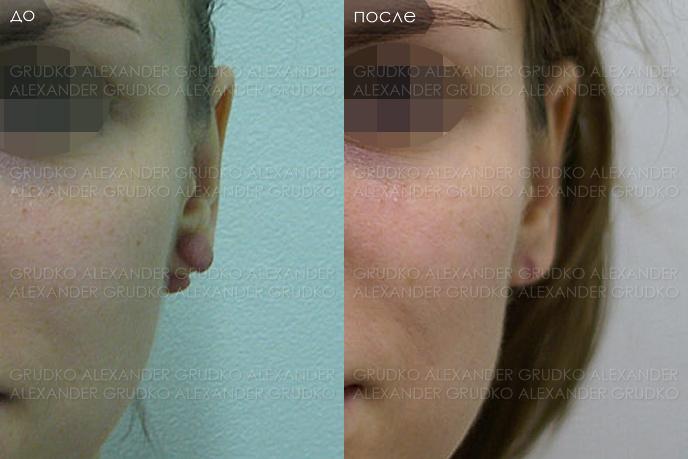 Фотография до и 3 месяца после лазерного удаления келоидного рубца на мочке уха.