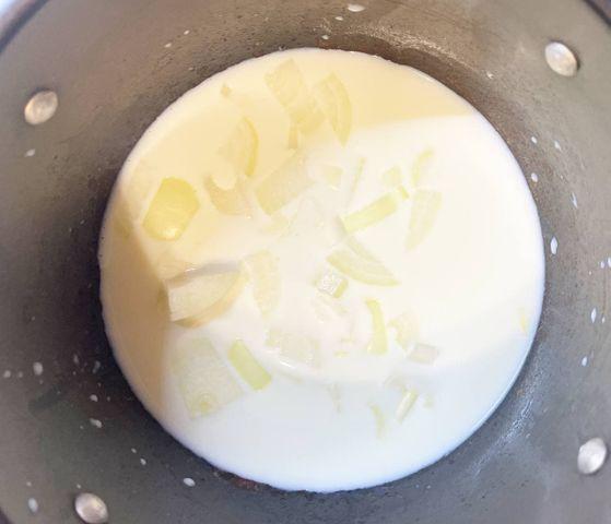 Очистите лук и нарежьте его кубиками. Выложите нарезанный лук в кастрюлю с молоком и доведите до кипения. После этого варите на медленном огне 5-10 минут, затем процедите.
