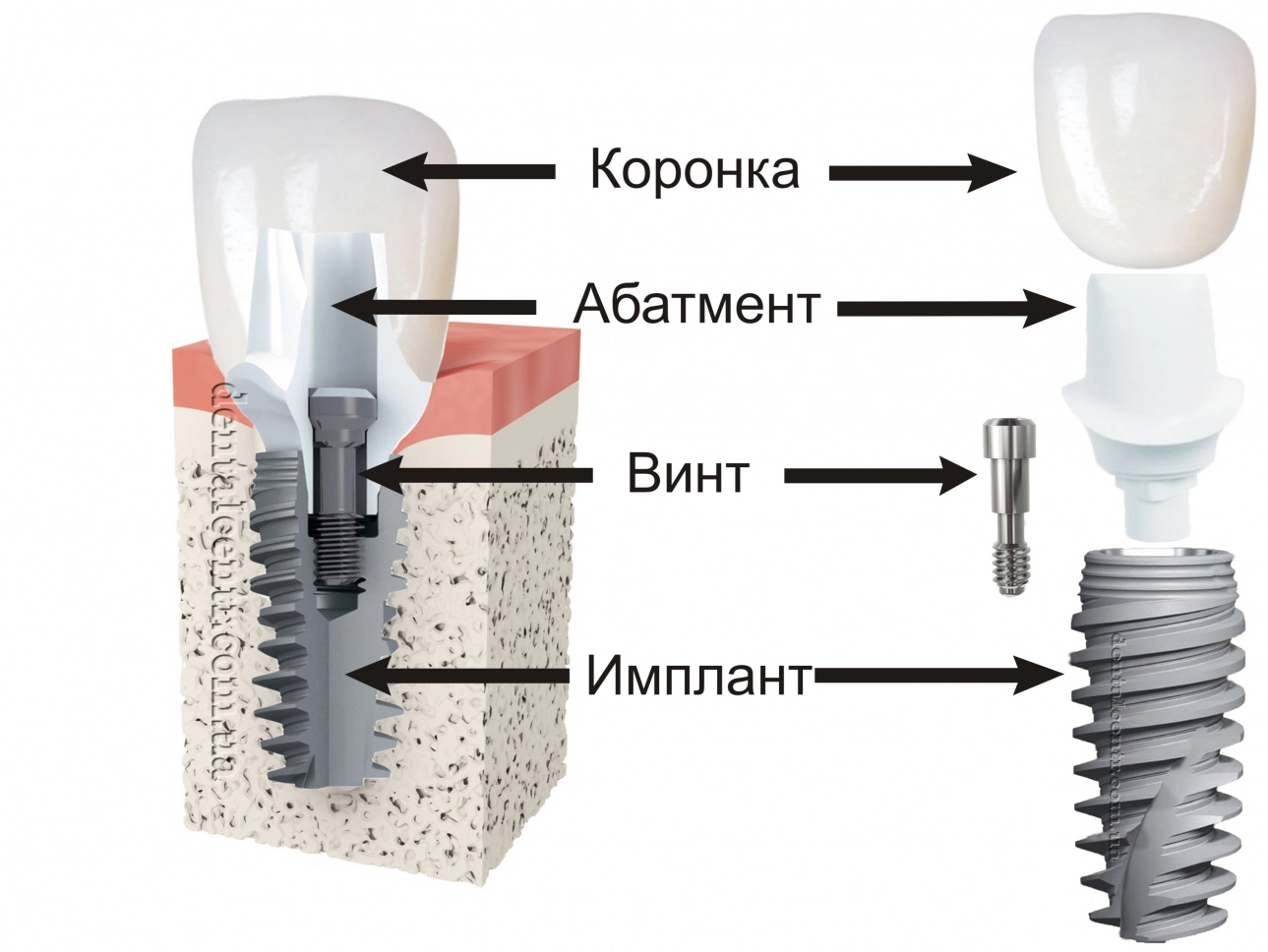 Имплантат является искусственным корнем зуба, который устанавливают в костную ткань, а позже, после приживления (обычно 2-3 месяца), на него фиксируют коронку.