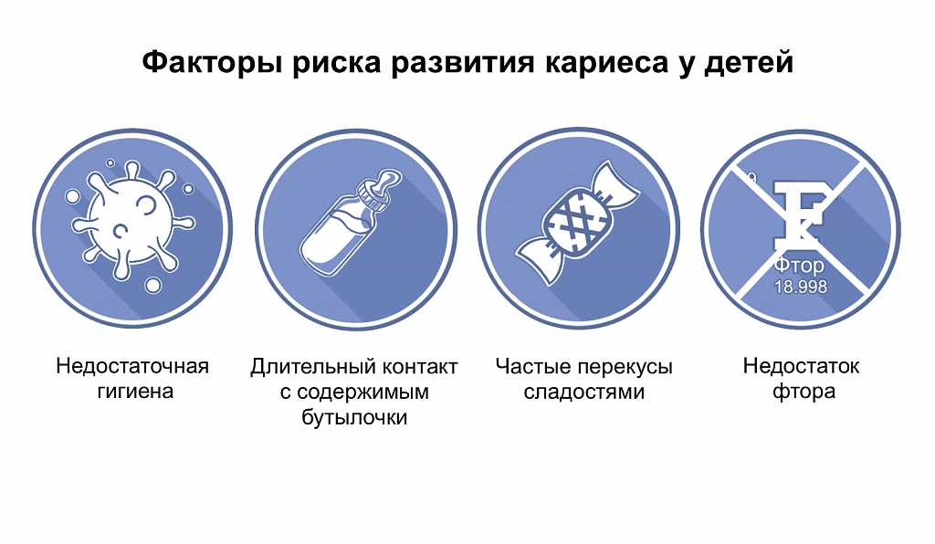 К факторам, способствующим кариесу у малышей, можно отнести три основные причины: недостаточная гигиена, неправильное питание и отсутствие профилактических мер.