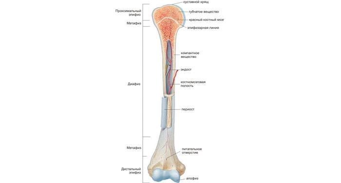 На длинной трубчатой кости выделяют несколько ключевых частей: